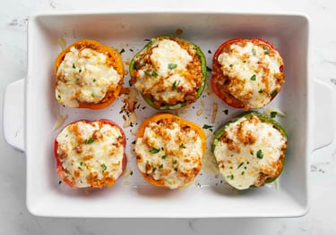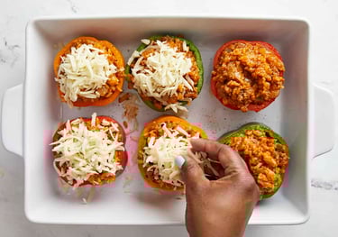 Top each bell pepper evenly with shredded mozzarella cheese. Loosely place some tented aluminum foil over the top of the casserole dish and bake for 15 minutes. After 15 minutes the bell peppers should be tender but not mushy.