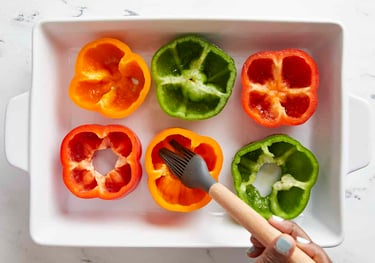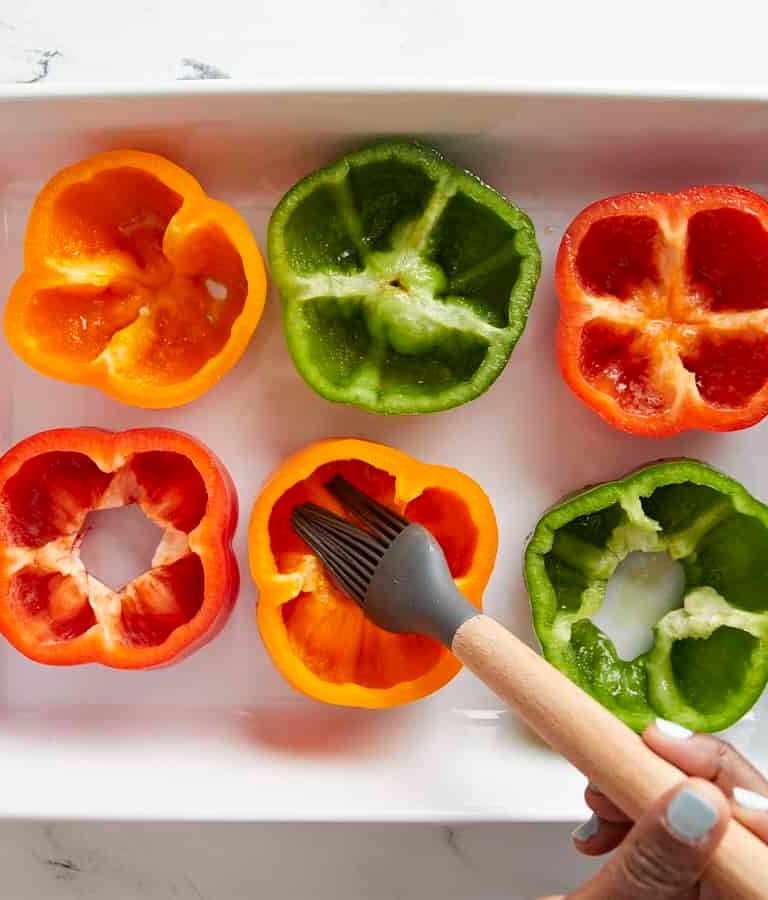 Place each bell pepper half in a 9×13-inch casserole dish. Brush the bell peppers with 1 Tbsp oil and season with ¼ tsp of salt and ¼ tsp cracked black pepper. Bake the bell peppers in a preheated oven for 20 minutes to soften. After 20 minutes remove the bell peppers from the oven and set aside.