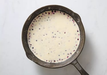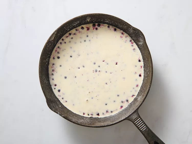 Tip blackcurrants into the prepared dish and arrange evenly. Pour batter carefully on top.