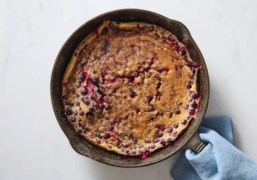 The miso paste adds a lowkey saltiness to this clafoutis, bringing out the flavor of vanilla and enriching the cream. Serve lukewarm with whipped cream.