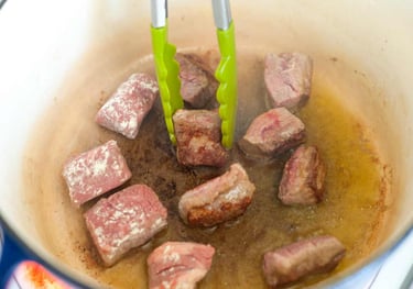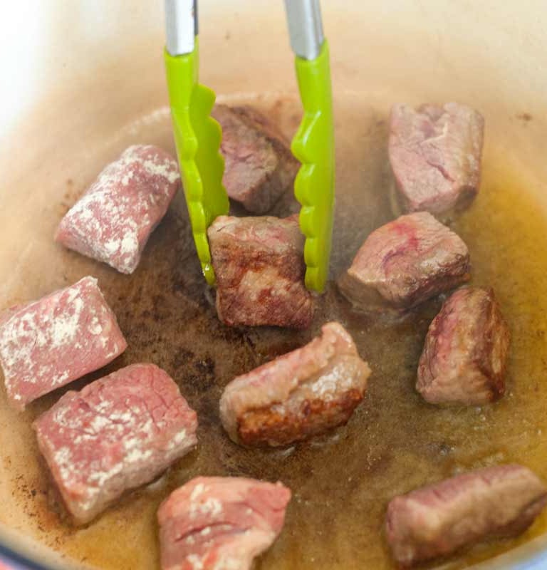 4) Heat 2 tablespoons of oil in a large Dutch oven over medium-high heat. When the oil shimmers, work in batches and add the floured beef cubes, making sure not to crowd them too much. Cook, turning occasionally, until the beef is well-browned on all sides. Transfer to a plate and then continue with the remaining beef cubes, adding more oil as necessary.