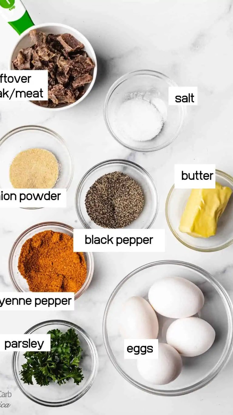 I recommend using steak that is thin cut. Thin steaks will fry quickly, which is what you want for breakfast. Try using a thin-cut bone-in rib-eye steak. If you find that a bit pricey, you can use chuck-eye steak instead. It’s almost as lovely but way cheaper. A New York strip works well too.